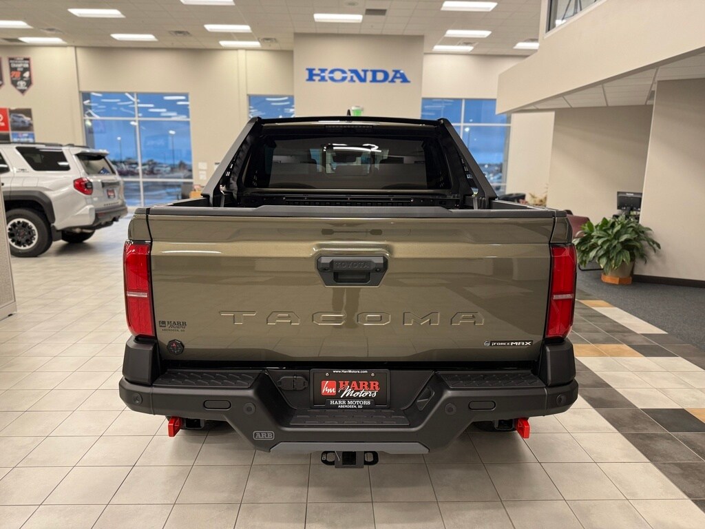 2.4L Hybrid Turbo I4 323hp 465ft. lbs. Harr Toyota is please to offer this 2025 Toyota Tacoma Hybrid in Bronze Oxide, Beautifully equipped with 2.4L Hybrid Turbo I4 323hp 465ft. lbs. 12V power outlets: 2 12V power outlets, 2.4L Hybrid Turbo I4 323hp 465ft. lbs., 3-point seatbelt: Rear seat center 3-point seatbelt, 4WD type: Part-time 4WD, 4X4, 50 STATE EMISSIONS, 8-Speed Shiftable Automatic, ABS Brakes: 4-wheel antilock (ABS) brakes, ABS Brakes: Four channel ABS brakes, Accessory power: Retained accessory power, Adaptive cruise control: Full-Speed Range Dynamic Radar Cruise Control (DRCC), Air conditioning: Yes, All-in-one key: All-in-one remote fob and ignition key, Alternator Type: Hybrid electric motor alternator, Amplifier, Antenna: Integrated roof audio antenna, Armrests front center: Front seat center armrest, Auto door locks: Auto-locking doors, Auto headlights: Auto on/off headlight control, Auto high-beam headlights: Automatic High Beams (AHB) auto high-beam headlights, Automatic curve slowdown cruise control, Autonomous cruise control: Hands-on cruise control, Basic warranty: 36 month/36,000 miles, Battery charge warning, Battery run down protection, Battery type: Lead acid battery, Beverage holders rear: Rear beverage holders, Beverage holders: Front beverage holders, Blind spot: Blind Spot Monitor (BSM), Body panels: Galvanized steel/aluminum body panels with side impact beams, Box style: Standard composite style pickup box, Brake assist system: Pre-Collision System w/Brake Assist predictive brake assist system, Brake type: 4-wheel disc brakes, Bumper insert: Metal-look front bumper insert, Bumper rub strip front: Black front bumper rub strip, Bumpers front: Body-colored front bumper, Bumpers rear: Black rear bumper, Cab mounted cargo light: LED cab mounted cargo light, Cabin air filter, Camera: Aerial view camera, Child door locks: Manual rear child safety door locks, Climate control: Automatic climate control, Clock: Digital clock, Compressor: Intercooled turbo, Configurable instrumentation gauges, Cooled front seats: Ventilated driver and front passenger seats, Corrosion perforation warranty: 60 month/unlimited, Cruise control: Cruise control with steering wheel mounted controls, Cylinder head material: Aluminum cylinder head, Day/Night rearview mirror, Digital signal processor, Door ajar warning, Door bins front: Driver and passenger door bins, Door bins rear: Rear door bins, Door handle material: Black door handles, Door locks: Power door locks with 2 stage unlocking, Door mirror style: Body-colored door mirrors, Door mirror type: Standard style side mirrors, Door mirrors: Power door mirrors, Door panel insert: Simulated stone door panel insert, Door trim insert: Leatherette door trim insert, Drive type: Four-wheel drive, Driver foot rest, Driver information center, Driver lumbar: Driver seat with 4-way power lumbar, Driver seat direction: Driver seat with 8-way directional controls, Dual-zone front climate control, Eco Feedback: ECO feedback display gauge, Electric power regeneration gauge: Electric power/regeneration gauge, Electric powertrain: HEV (hybrid electric vehicle), Electronic parking brake, Electronic stability control: Electronic stability control system, Emergency SOS Capable: Safety Connect (1-year trial) vehicle integrated emergency SOS system, Engine block material: Aluminum engine block, Engine cooler: Engine oil cooler, Engine Cylinders: I-FORCE MAX I4, Engine Location: Front mounted engine, Engine Mounting direction: Longitudinal mounted engine, Engine: I-FORCE MAX 2.4L I-4 port/direct injection, DOHC, variable valve control, intercooled turbo, regular unleaded, engine with 278HP, Engine/electric motor temperature gauge, Exterior 120V AC power outlet: 1 exterior 120V AC power outlet, External acoustic pedestrian alert, External memory: External memory control, Fenders: Black fender flares, First-row windows: Power first-row windows, Floor console storage: Covered floor console storage, Floor console: Full floor console, Floor coverage: Full floor coverage, Floor covering: Full carpet floor covering, Floor mats: Rubber front and rear floor mats, Fob engine controls: Smart Key with hands-free access and push button start, Fog lights: Rigid Industries LED front fog lights, Folding door mirrors: Manual folding door mirrors, Folding rear seats: 60-40 folding rear seats, Forward collision warning: Toyota Safety Sense P (TSS-P) forward collision mitigation, Front anti-roll bar disconnect, Front anti-roll: Front anti-roll bar, Front anti-whiplash head restraints: Anti-whiplash front seat head restraints, Front camera: Front mounted camera, Front head restraint control: Manual front seat head restraint control, Front head restraints: Height adjustable front seat head restraints, Front impact airbag driver: Driver front impact airbag, Front impact airbag passenger: Passenger front impact airbag, Front passenger lumbar: Front passenger seat with 4-way power lumbar, Front reading lights, Front seat upholstery: SofTex leatherette front seat upholstery, Front seatback upholstery: Leatherette front seatback upholstery, Front side impact airbag driver: Seat mounted side impact driver airbag, Front side impact airbag passenger: Seat mounted side impact front passenger airbag, Fuel door: Manual fuel door release, Fuel Type: Regular Unleaded, Full gauge cluster screen, Garage door opener: HomeLink garage door opener, Gauge cluster display size (inches): Gauge cluster display size: 12.30, Gearshifter material: Leather and metal-look gear shifter material, Glove box: Locking glove box, Grille style: Black grille, Ground view camera: Multi-Terrain Monitor (MTM) ground view camera, Handsfree: Bluetooth handsfree wireless device connectivity, Head up display: Head-up display, Headlight type: Projector beam headlights, Headlights: LED low and high beam headlights, Headliner coverage: Full headliner coverage, Headliner material: Cloth headliner material, Heated door mirrors: H